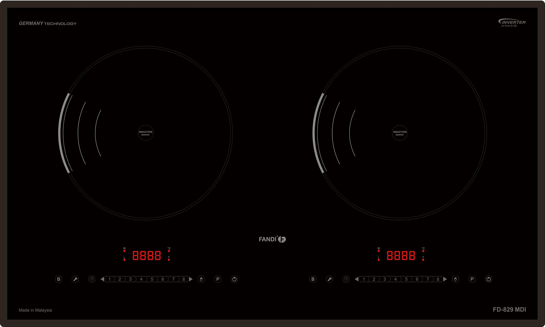 FD - 829 MDI thiết kế hiện đại, sang trọng với 2 vùng nấu riêng biệt, với điều khiển cảm ứng phím trượt slide dạng ẩn hiện đại nhanh nhạy và dễ sử dụng với những thao tác trượt nhẹ, tiết kiệm điện năng hiệu quả, an toàn tuyệt đối.