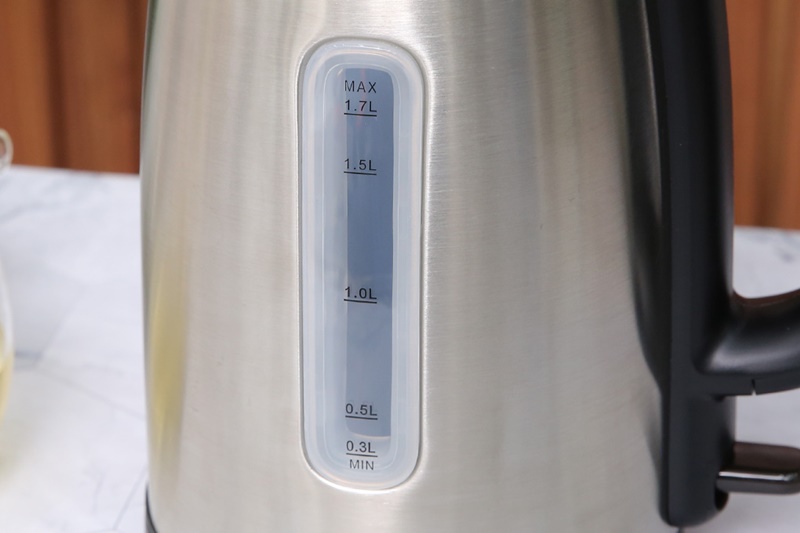 Bình đun siêu tốc có cột hiển thị mực nước với các vạch mức rõ ràng, cho người dùng tiện châm nước