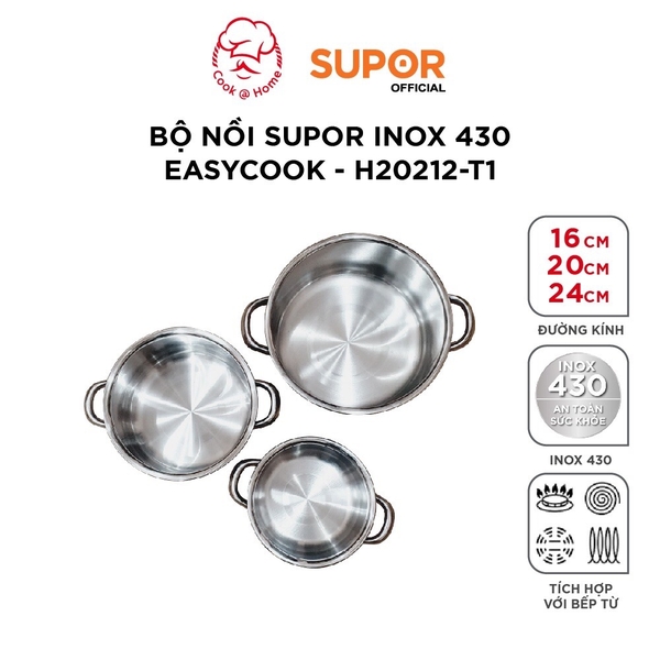 Bộ nồi Supor inox 430 Easycook size 16/20/24cm - H20212-T1