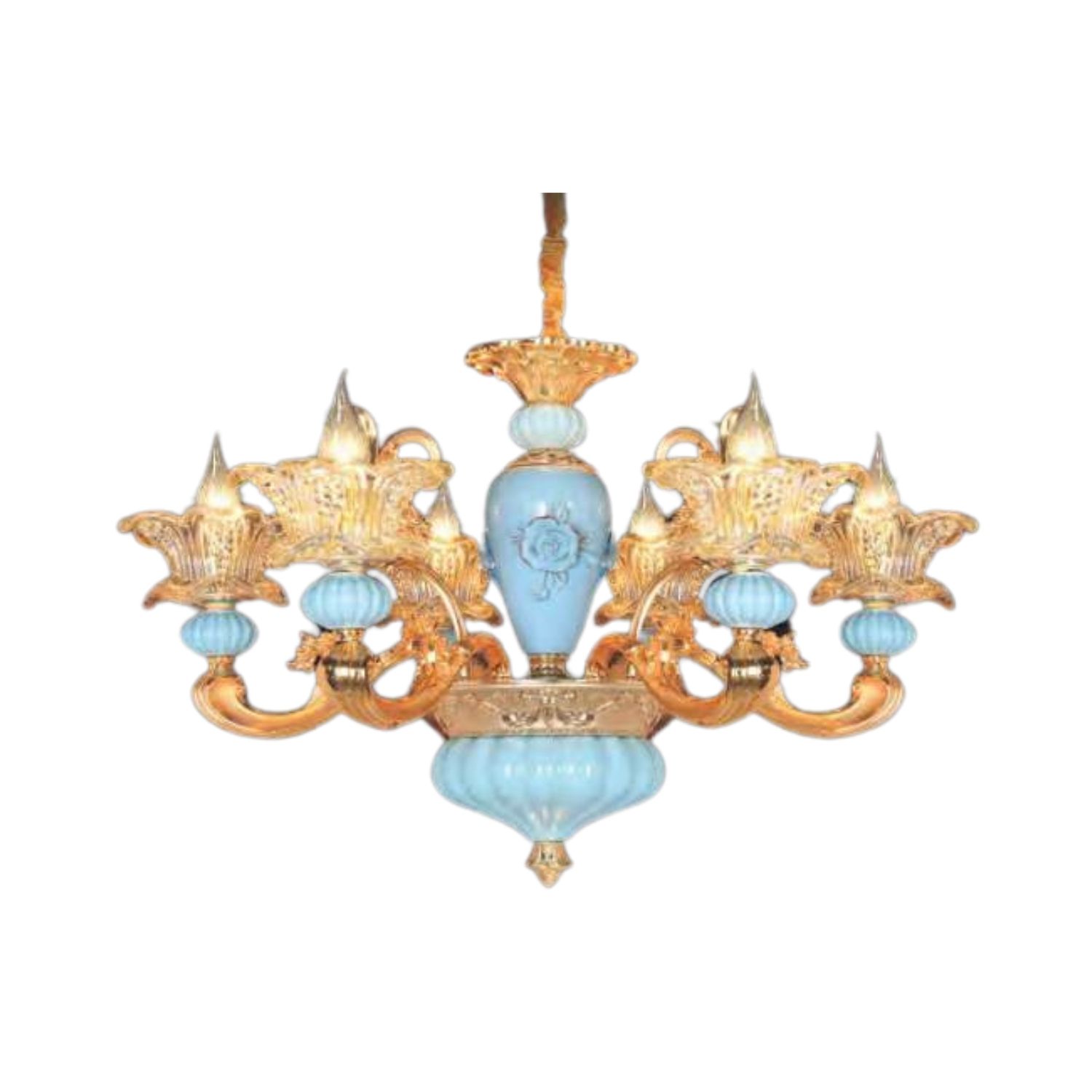 Hệ thống chiếu sáng của đèn sử dụng 6 bóng đèn chuẩn chuôi E14. Các bóng đèn được bố trí đều trên thân đèn giúp ánh sáng lan tỏa rộng, mang lại nguồn sáng ổn định cho không gian sử dụng. Ánh sáng khi chiếu qua các chao đá tạo nên hiệu ứng dịu nhẹ, giúp căn phòng trở nên ấm áp và dễ chịu.