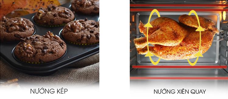 Sự kết hợp giữa dàn nướng trên và dàn nướng dưới với 5 chức năng nướng giúp bạn thực hiện được nhiều loại món ăn khác nhau với độ chín đều hoàn hảo. Ngoài ra, tính năng nướng đối lưu với hệ thống quạt đối lưu bên trong lò giúp lưu thông khí nóng làm cho thực phẩm chín đều, vàng đều và giòn đều. Nướng đối lưu với cơ chế quay đều của Lò nướng Sharp giúp các món nướng như gà quay, vịt quay chín vàng đều hơn bao giờ hết.