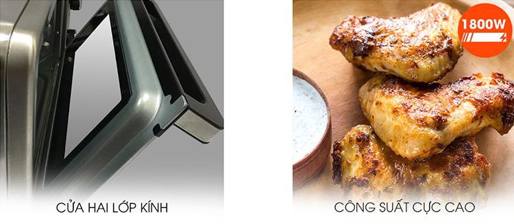 Lớp cửa kính của Lò nướng được trang bị 2 lớp có khả năng chịu nhiệt tốt, an toàn cho người sử dụng. Cấu tạo cửa kính tốt còn hỗ trợ duy trì nhiệt trong lò nướng ổn định trong suốt quá trình nướng. Sản phẩm có trang bị đèn lò giúp bạn dễ quan sát thực phẩm trong suốt quà trình nấu nướng.