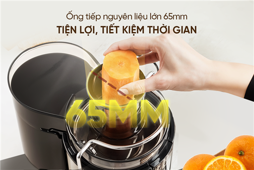 Máy được trang bị ống tiếp nguyên liệu đường kính 65mm, đủ rộng để cho cả trái cây nguyên quả hoặc miếng lớn mà không cần cắt nhỏ. Nhờ đó, công đoạn sơ chế được rút ngắn, giữ nguyên dưỡng chất trong thực phẩm và tiết kiệm đáng kể thời gian.