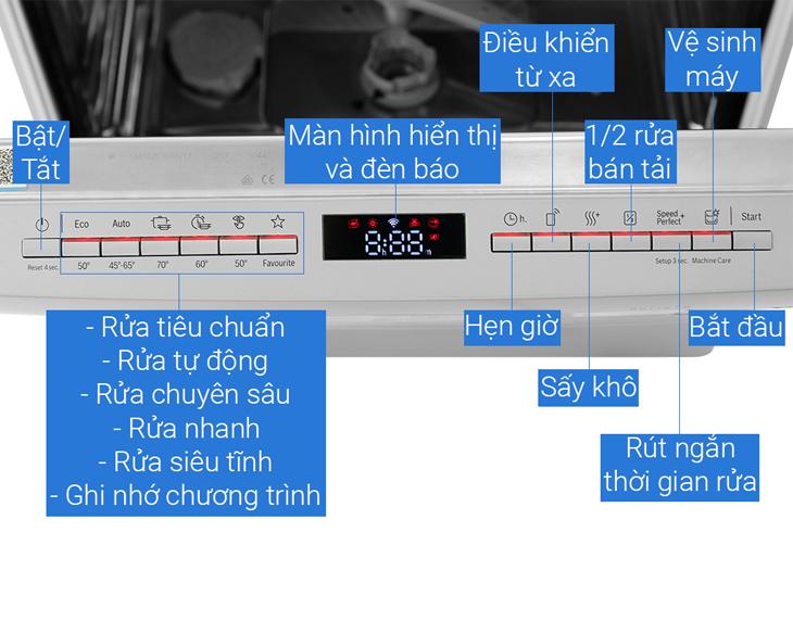 Máy tích hợp 6 chương trình rửa tiện ích: rửa chuyên sâu (Intensive), rửa tự động (Auto), rửa tiêu chuẩn (Eco), rửa siêu tĩnh (Silence 50), rửa nhanh (Express 60°C) và chế độ yêu thích (Favourite).