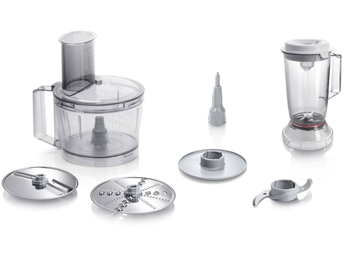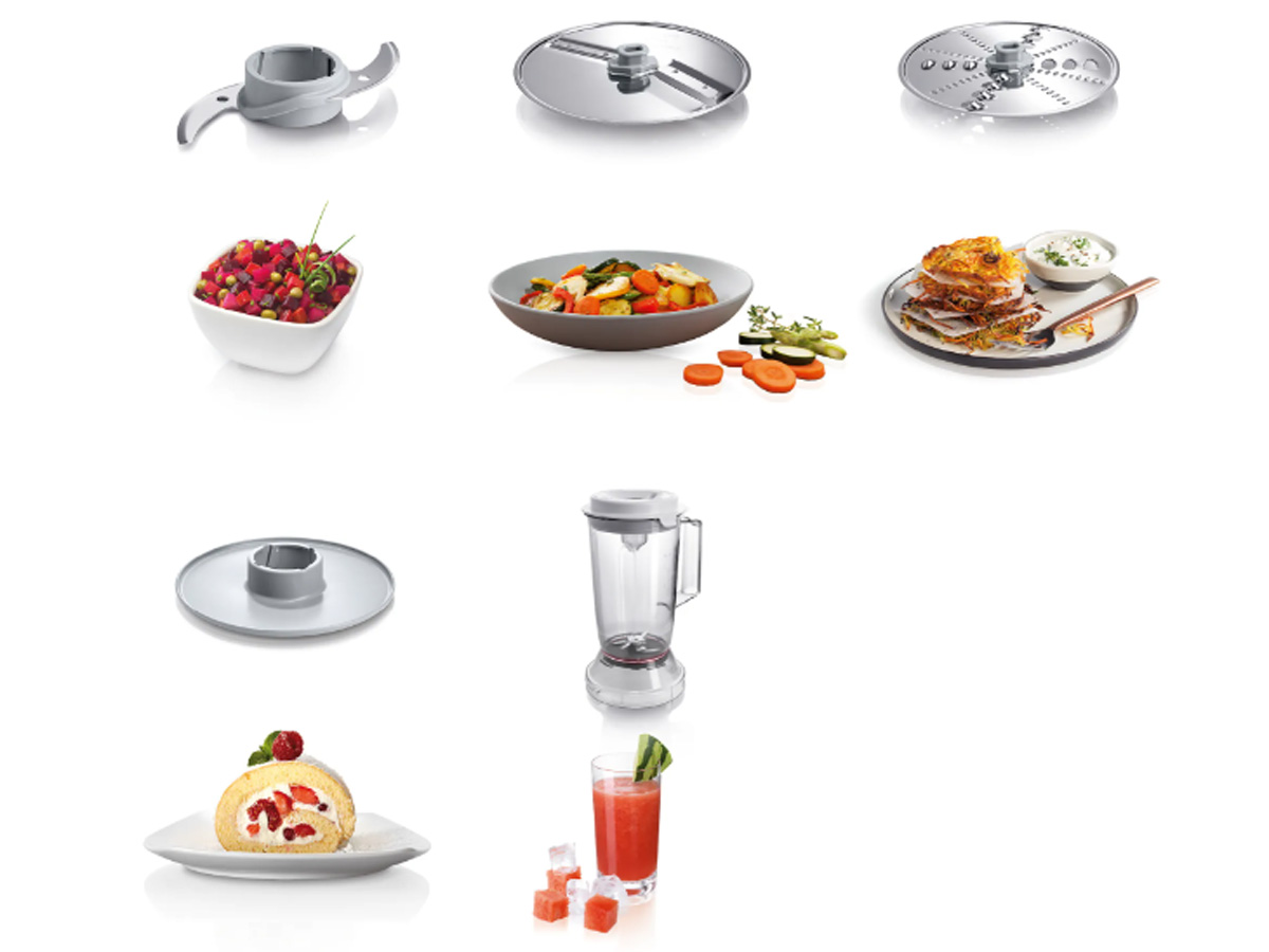 Hệ phụ kiện đa dạng gồm lưỡi dao thép không gỉ sắc bén, đĩa cắt và bào hai mặt, đĩa đánh kem, cối xay sinh tố… tối ưu hiệu suất trong nhiều tác vụ