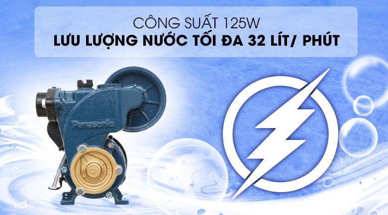 Với công suất 125W, máy bơm nước tăng áp Panasonic A-130JAK 125W sẽ có thể hoạt động để đáp ứng tốt nhu cầu tăng áp lực nước cho gia đình trong quá trình sinh hoạt, với lưu lượng nước tối đa bơm được đạt 32 lít/ phút.