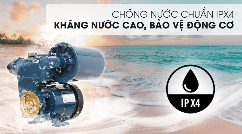 Máy bơm nước gia đình này được hãng trang bị chuẩn chống nước IPX4, đồng nghĩa máy có thể kháng nước nếu bị bắn vào bất kì vị trí nào, giúp bảo vệ động cơ bên trong an toàn nhất.