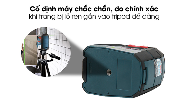 Máy cân mực laser Bosch này được thiết kế với mặt đế có lỗ ren ¼ inch để kết nối với chân tripod mà người dùng có thể tự mua thêm bên ngoài giúp cố định máy, tạo nên sự chắc chắn và chính xác khi sử dụng trong thời gian dài.