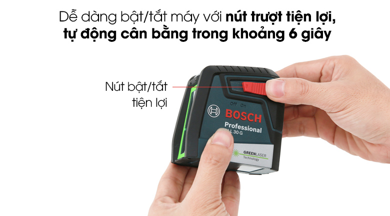 Máy cân bằng laser (máy cân mực laser) được thiết kế trực quan nằm ngay thân máy giúp người dùng có thể trượt dễ dàng để khởi động kích hoạt máy và tự động cân bằng trong khoảng thời gian 6 giây.
