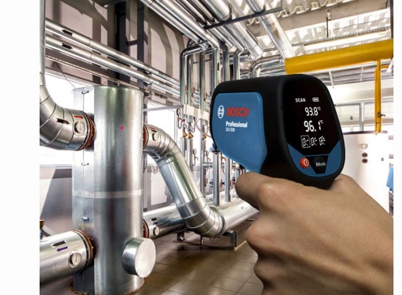 - Máy đo nhiệt độ Bosch GIS 500 có khả năng đo những nguồn nhiệt từ xa sử dụng kỹ thuật đo bằng hồng ngoại, kết hợp với kỹ thuật laser để định vị nguồn nhiệt