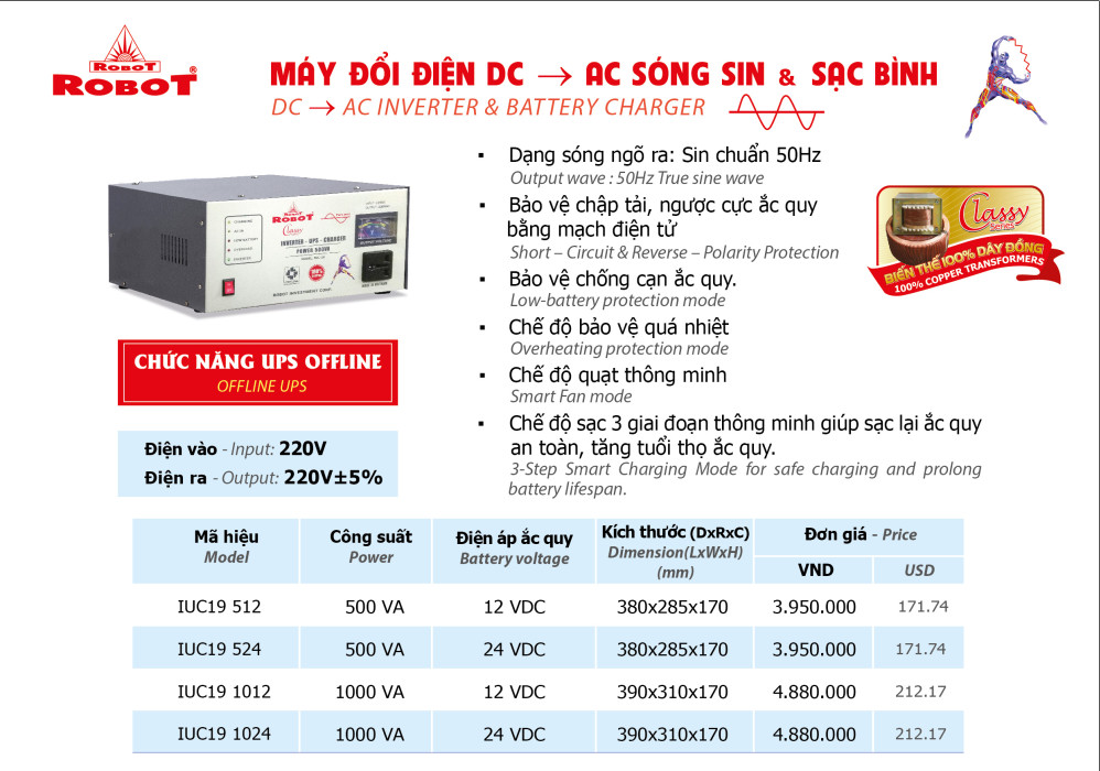 Máy Đổi Điện DC-AC Sóng Sin Cho Ô Tô 1000VA có một số ưu điểm như: tự động bật inverter khi mất lưới điện. Khi có điện trở lại tự động đóng tải qua sử dụng lưới điện và sạc lại ắc quy đồng thời ngắt inverter.; tự động chuyển qua chế độ sạc dự phòng khi ắc quy đầy..