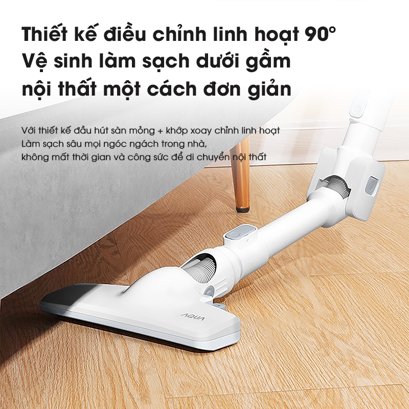 Thiết bị được thiết kế với khớp xoay linh hoạt có thể điều chỉnh góc đến 90°, giúp dễ dàng làm sạch khu vực dưới gầm bàn ghế, giường tủ mà không cần di chuyển nhiều đồ đạc. Đầu hút sàn mỏng gọn kết hợp cùng cơ chế xoay linh hoạt cho phép tiếp cận các vị trí khó chạm tới. Với kích thước 122.6 x 17.4 x 23 cm và trọng lượng chỉ 1.96 kg, máy mang lại cảm giác nhẹ nhàng khi sử dụng và thuận tiện khi cất giữ hoặc mang theo. Tay cầm được thiết kế vừa vặn, chắc chắn, cùng vị trí công tắc hợp lý giúp thao tác dễ dàng chỉ với một tay.
