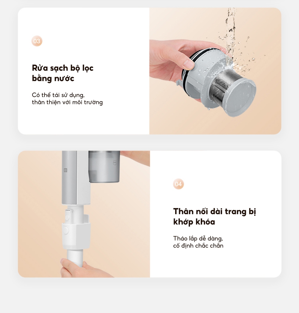 Hộp chứa bụi dung tích 0,8 lít cho phép thu gom lượng bụi lớn trong một lần vệ sinh. Người dùng có thể tháo rời hộp bụi chỉ bằng một nút bấm để đổ rác và làm sạch bộ lọc nhanh chóng. Dây điện dài 5 mét tạo sự linh hoạt khi di chuyển trong phạm vi rộng mà không cần thay đổi ổ cắm liên tục. Thân máy còn được trang bị khớp nối dài có thể khóa chắc chắn, dễ dàng chuyển đổi sang chế độ cầm tay khi cần.