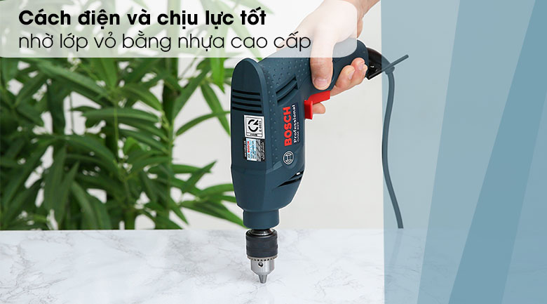 Lớp vỏ máy khoan điện Bosch làm bằng chất liệu nhựa cao cấp, không chỉ mang lại hiệu quả cách điện tốt mà còn chịu được lực tác động mạnh, cùng với kết cấu máy rắn chắc, giúp người dùng an tâm sử dụng trong suốt quá trình khoan.