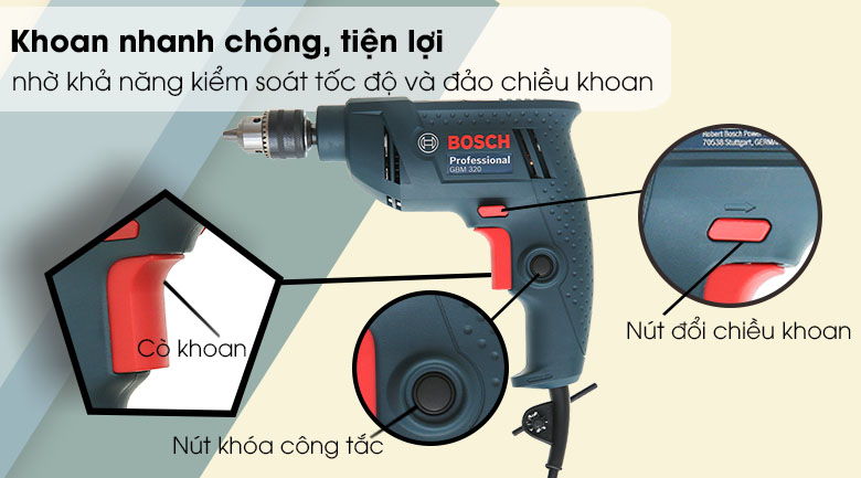 Bosch GBM 320 320W có khả năng kiểm soát tốc độ cùng với nút khóa giữ cò máy nằm ở vị trí thuận tiện trên tay cầm, giúp người dùng nhanh chóng điều chỉnh tốc độ khoan phù hợp với độ cứng mềm của vật liệu.