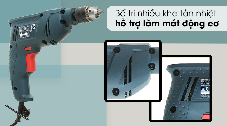 Vỏ máy khoan Bosch GBM 320 320W còn được nhà sản xuất bố trí nhiều khe tản nhiệt, hỗ trợ làm mát động cơ trong thời gian hoạt động nhằm góp phần nâng cao tuổi thọ cho máy khoan.