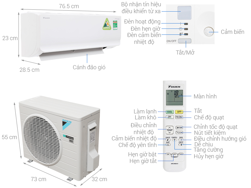 | Thông tin cục nóng | Dài 73 cm - Cao 55 cm - Dày 32 cm - Nặng 26 kg |