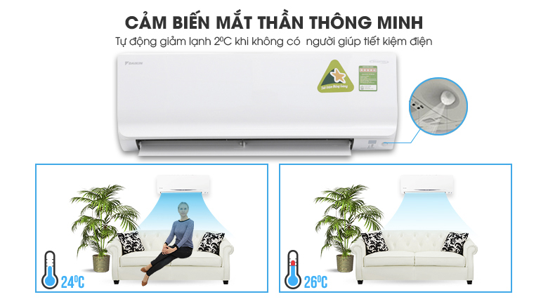 Mắt thần thông minh một khu vực - Intelligent Eye có khả năng cảm biến chuyển động trong phòng, tự động tăng 2 độ C khi không có người sử dụng, từ đó giúp tiết kiệm điện năng cho bạn. Khi có người trở lại phòng, máy sẽ tự động điều chỉnh nhiệt độ trở lại như ban đầu.