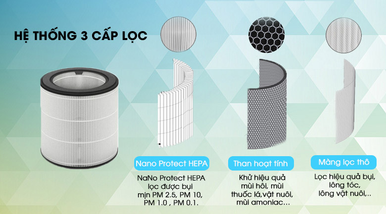 - Bộ lọc Nano Protect HEPA: Với lớp lọc Nano Protect HEPA giúp loại bỏ hơn 99.97% hạt siêu nhỏ có kích thước 0.003 micron, lọc được bụi mịn PM2.5, PM10, PM1.0, PM0.1.