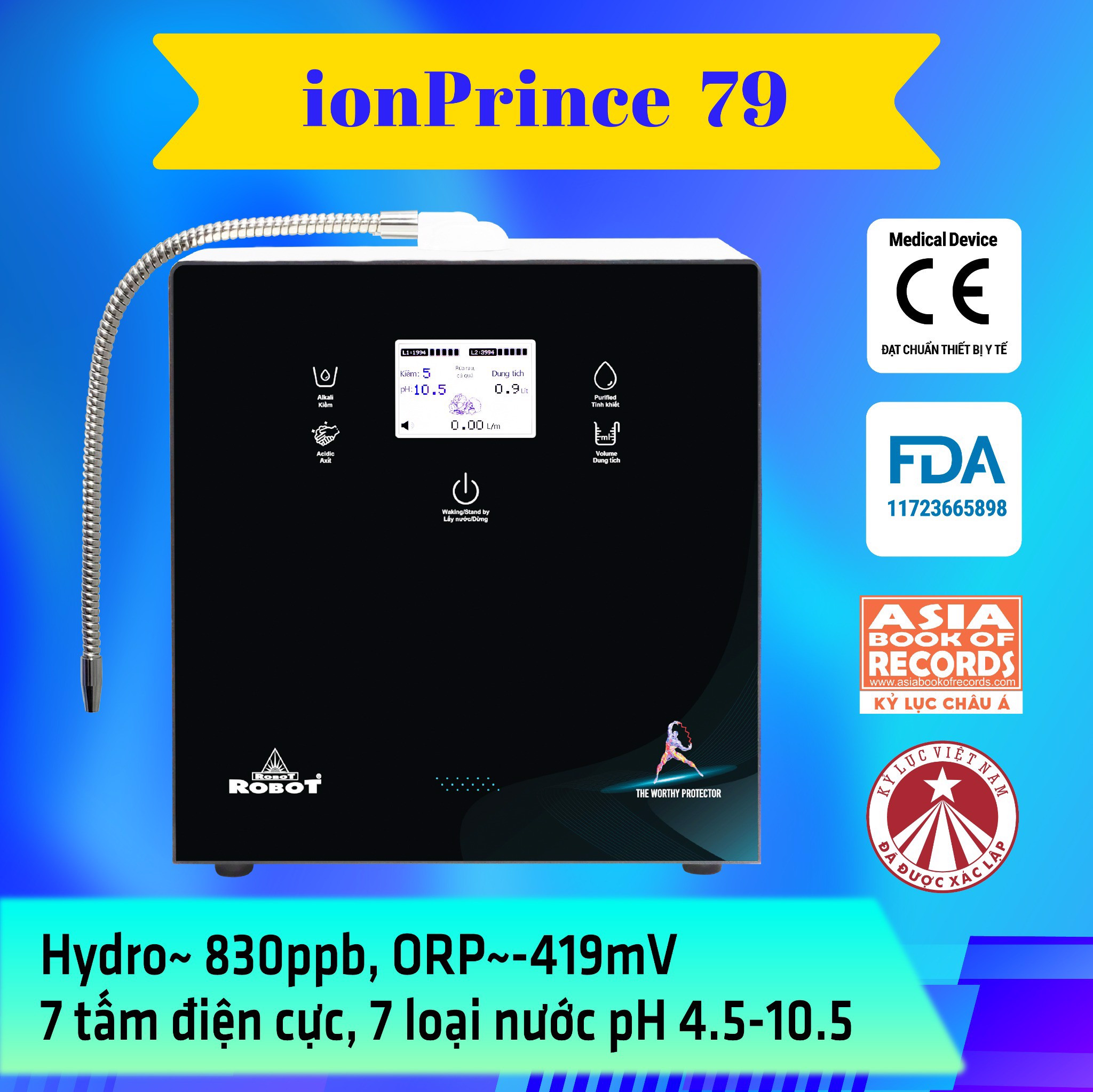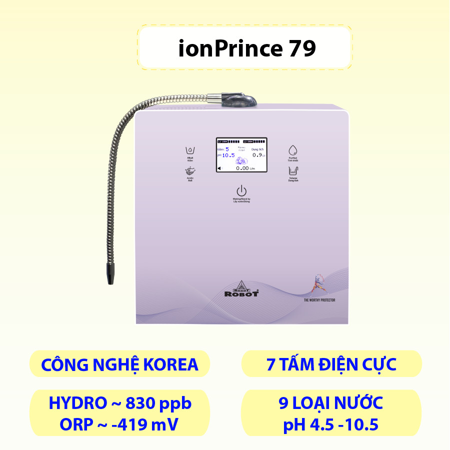 Với sứ mệnh mang đến nguồn “Nước tốt – Nước khỏe” cho cộng đồng, Máy lọc nước điện giải iON kiềm ROBOT ionPrince 79 là kết quả tâm huyết của đội ngũ kỹ sư ROBOT giàu kinh nghiệm, ứng dụng công nghệ hiện đại kết hợp cùng các chuyên gia đầu ngành điện giải Hàn Quốc. Được giới chuyên môn đánh giá là sản phẩm điện giải đột phá vượt trội & tạo nên xu hướng tiêu dùng trong thời đại mới với hàng loạt công nghệ mới và tính năng tiện ích được tích hợp.