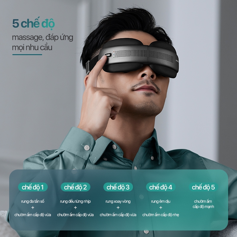 Sản phẩm cung cấp năm chế độ massage linh hoạt, bao gồm một chế độ chườm ấm và bốn chế độ rung khác nhau như rung đa tần, rung theo nhịp điệu, rung vòng tròn và rung nhẹ. Nhờ đó, người dùng có thể lựa chọn chế độ phù hợp với nhu cầu thư giãn, hỗ trợ giảm khô da, tăng tuần hoàn máu và cải thiện tình trạng quầng thâm hoặc bọng mắt.