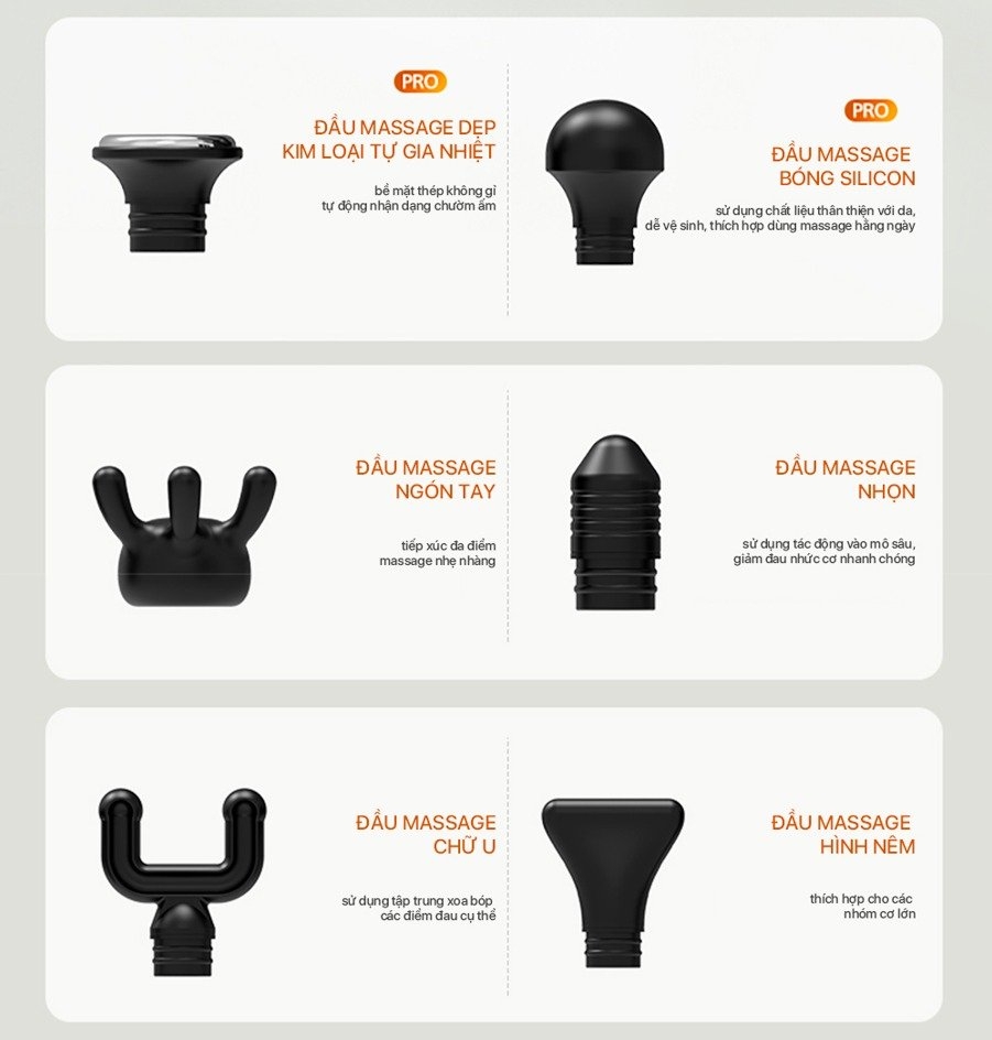 Sản phẩm đi kèm 6 đầu massage khác nhau để phù hợp với từng vùng cơ. Đầu chữ U thích hợp cho cổ và hai bên cột sống, đầu tròn dành cho nhóm cơ lớn như vai, lưng, hông và đùi. Đầu trụ hỗ trợ tác động sâu vào mô cơ và huyệt đạo. Đầu phẳng kim loại chuyên dùng cho chức năng chườm nóng. Ngoài ra còn có đầu silicon mô phỏng đầu ngón tay, mang lại cảm giác massage chân thực hơn.