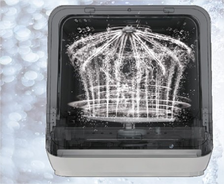 2 tay phun tia nước đa chiều theo hướng dọc. Có 4 lỗ phun ở tay phun bên trên và 10 lỗ phun ở tay phun bên dưới. Mỗi lổ phun được bố trí để phun cố định 1 góc 360°. Máy Rửa Chén Mini Toshiba DWS-22AVN(K) có tay phun hình cánh quạt để giảm lực cản, phun mạnh và làm sạch mọi khu vực khó tiếp cận của chén bát.