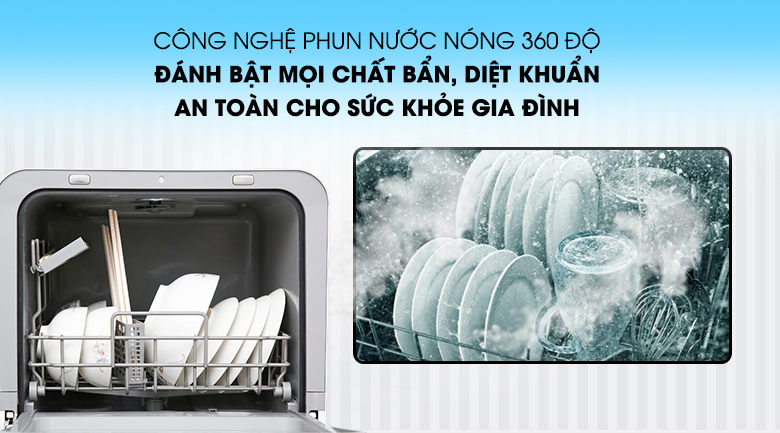Sản phẩm còn trang bị công nghệ phun nước nóng 360 độ với nhiệt độ nước 70 độ C, loại bỏ nhanh chóng chất bẩn, giúp chén bát sạch nhanh, diệt khuẩn tốt.