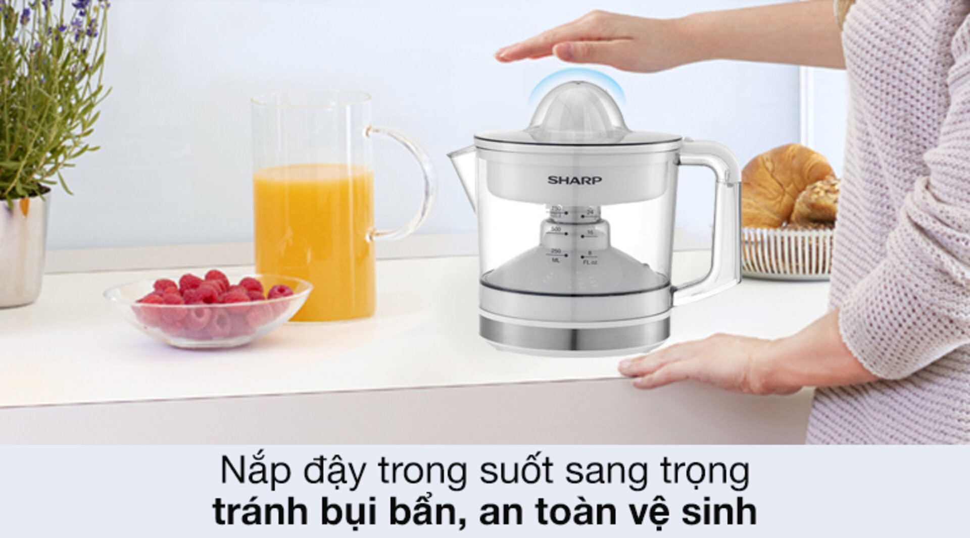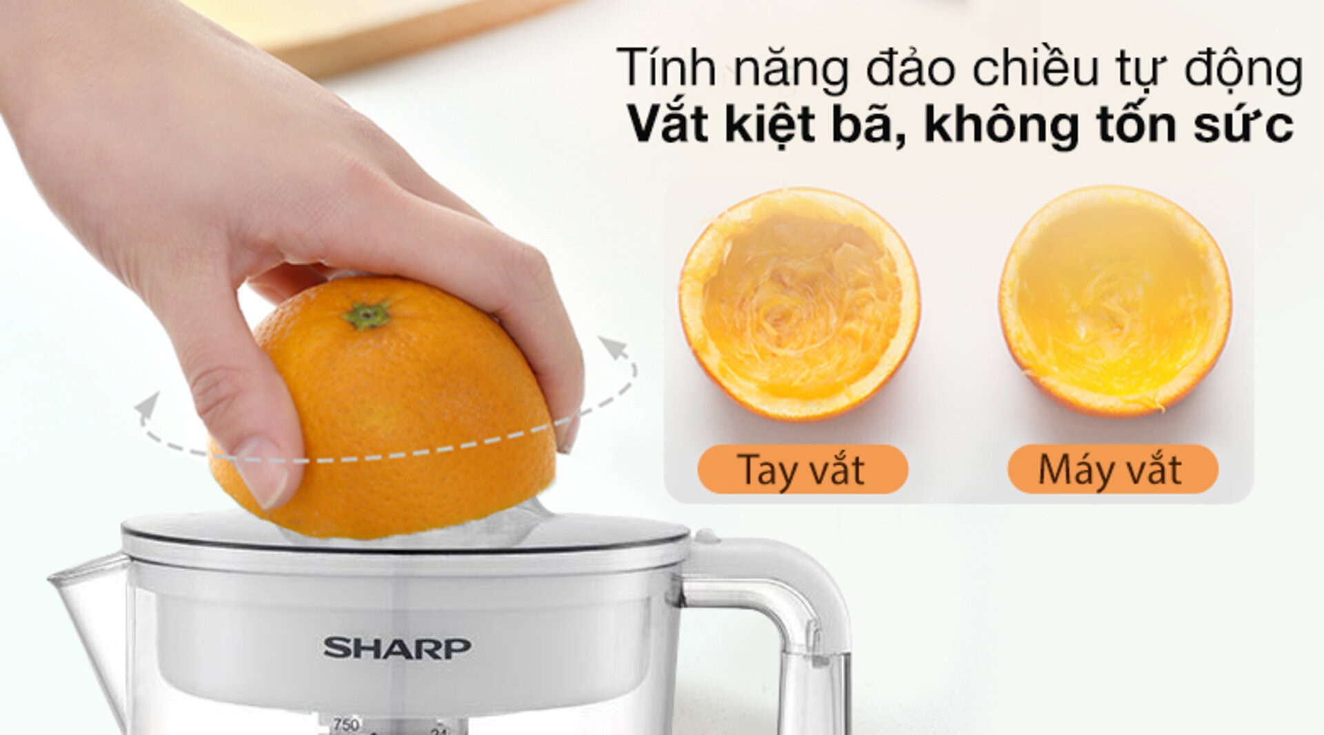 Thao tác vắt đơn giản cho mọi người dùng bằng cách nhấn và xoay trên đầu vắt máy vắt cam Sharp. Máy sẽ tự động làm việc trong khi bạn không cần dùng nhiều lực như khi ép thủ công.