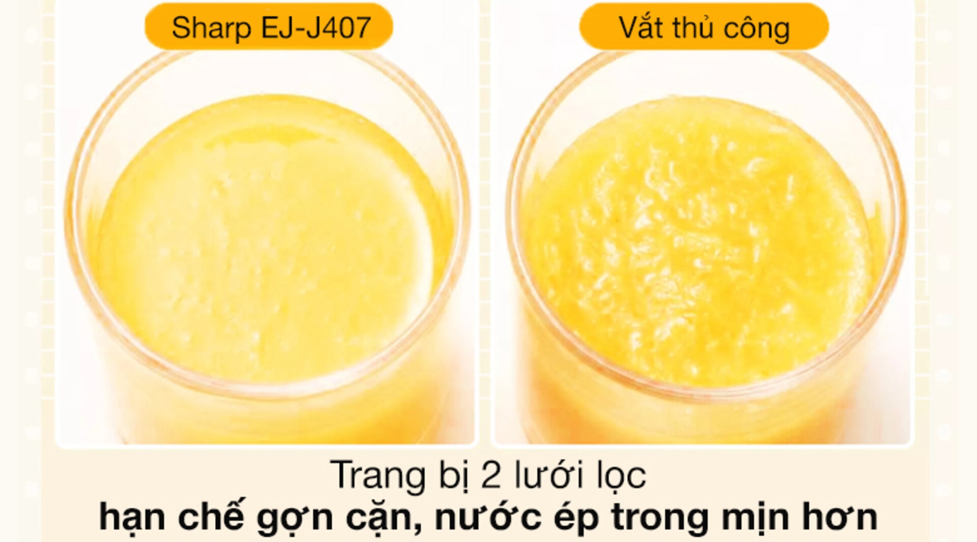 Nhờ vào thiết kế 2 lưới lọc, máy vắt cam Sharp EJ-J407-WH có khả năng lọc được phần lớn lượng bã cam phát sinh trong quá trình vắt, giúp cho ly nước cam được trong và sánh mịn hơn.