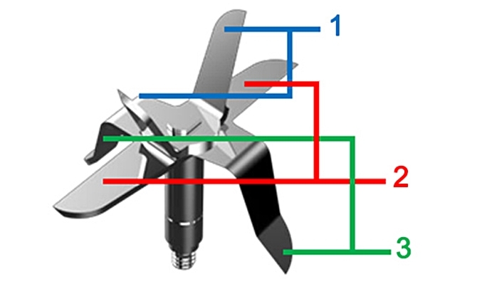 Máy xay sinh tố trang bị lưỡi dao với 3 chức năng: lưỡi răng cưa nghiền thực phẩm cứng và thực phẩm có nhiều xơ, lưỡi sắc băm nhuyễn và trộn thực phẩm với tốc độ cao, lưỡi cùn khuấy trộn thực phẩm và duy trì dòng xoáy.