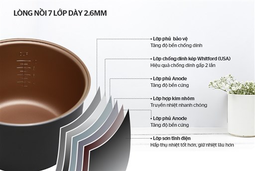 Lòng nồi được thiết kế với cấu trúc 7 lớp vật liệu cao cấp, trong đó có 2 lớp phủ anode cứng cáp, hạn chế móp méo khi va chạm và tăng khả năng giữ nhiệt. Độ dày 2.6mm giúp nhiệt lan tỏa đều, giữ cơm nóng lâu hơn và thơm ngon hơn. Đặc biệt, lớp chống dính kép Whitford (USA) bền bỉ gấp đôi thông thường, chống bong tróc và hoàn toàn an toàn cho sức khỏe người dùng.