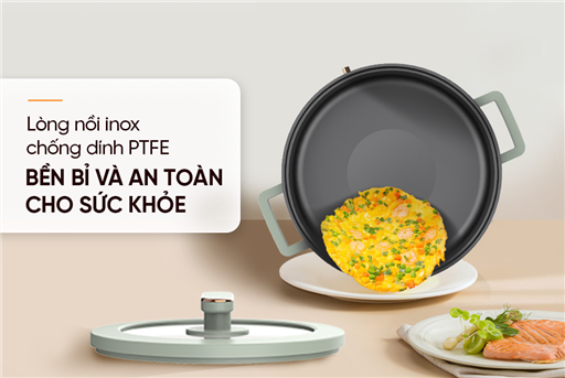 Lòng nồi được chế tạo từ inox 304 cao cấp, có khả năng chống oxy hóa, chịu nhiệt tốt và đặc biệt được phủ lớp chống dính PTFE siêu bền.