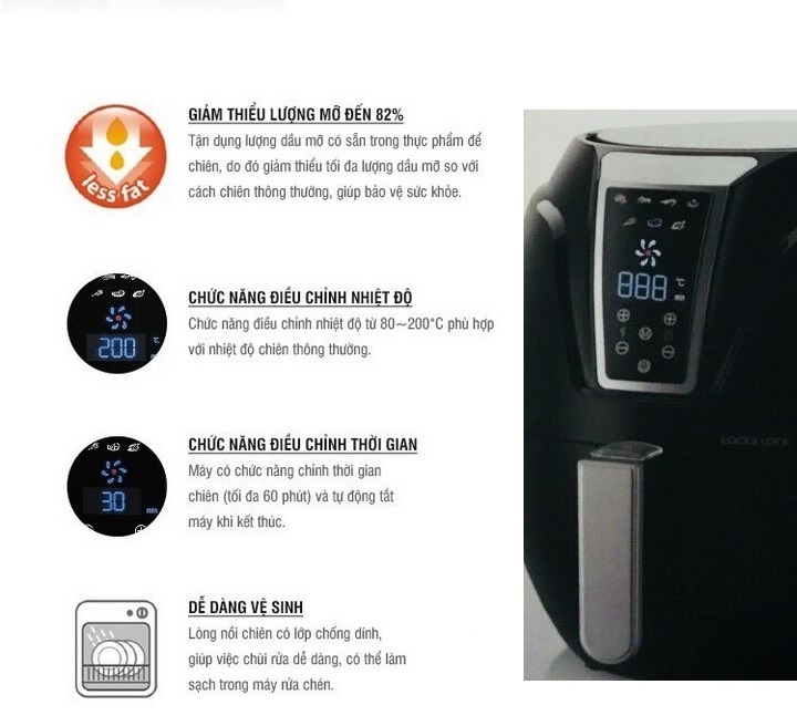 Nồi Chiên Không Dầu Lock&Lock EJF361BLK ứng dụng kỹ thuật tuần hoàn không khí với tốc độ cao - là kỹ thuật đạt bằng sáng chế độc quyền, thực phẩm chiên giòn, hương vị ngon và bổ dưỡng mà không cần dầu mỡ. Nồi chiên sẽ tận dụng lượng dầu mỡ có sẵn trong thực phẩm để chiên, do đó giảm thiểu tối đa lượng dầu mỡ so với cách chiên thông thường, giúp bảo vệ sức khỏe.
