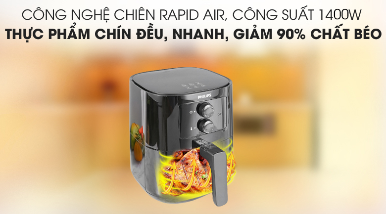 Thưởng thức món ăn lành mạnh, giòn ở bên ngoài và mềm ở bên trong nhờ công nghệ chiên Rapid Air giảm lượng chất béo đến 90%, công suất 1400W chiên nướng nhanh