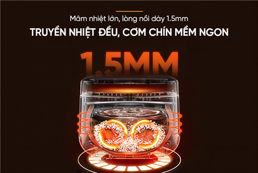 Lòng nồi dày 1.5mm còn giúp giữ nhiệt lâu hơn, giúp cơm luôn nóng hổi trong suốt bữa ăn mà không làm khô hạt.