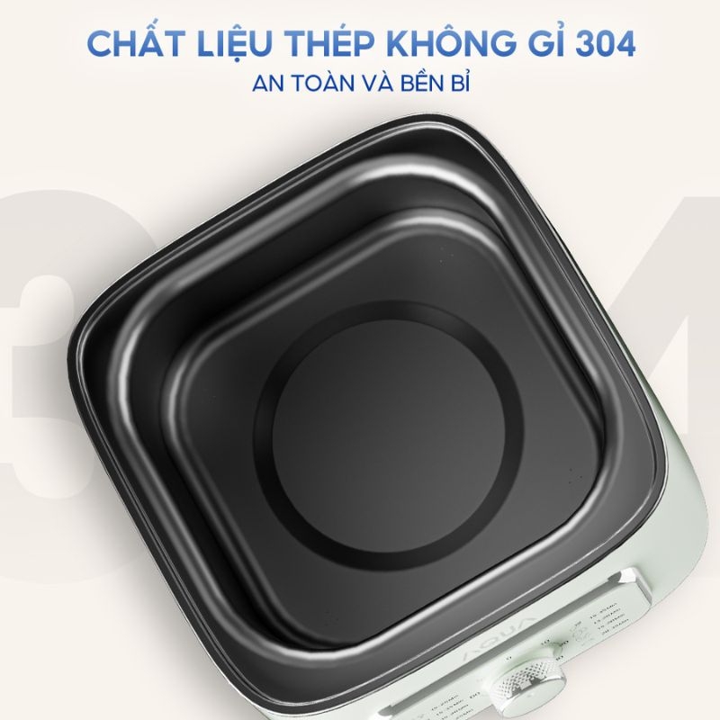 Thiết bị sở hữu kiểu dáng gọn gàng, màu sắc trẻ trung, phù hợp với nhiều phong cách bếp khác nhau. Phần thân và xửng hấp được làm từ inox SUS304 bền bỉ, chống ăn mòn và an toàn khi tiếp xúc thực phẩm. Các chi tiết nhựa PP và PC đạt chuẩn an toàn, không gây mùi trong quá trình sử dụng, góp phần giữ trọn hương vị món ăn.