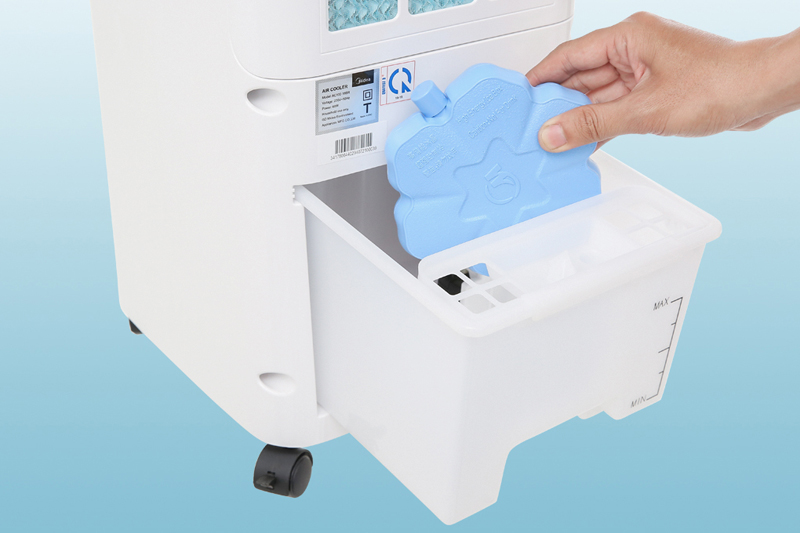 Khi mua quạt sẽ có thêm 2 hộp đá khô, đây là 1 loại đá hóa học, cho hộp đá khô vào ngăn đá tủ lạnh (đá này có thể tái sử dụng) khi muốn làm lạnh. Sau đó cho chúng vào bình chứa nước của quạt sẽ giúp giảm nhiệt độ hơi nước tỏa ra để không gian được mát mẻ hơn.