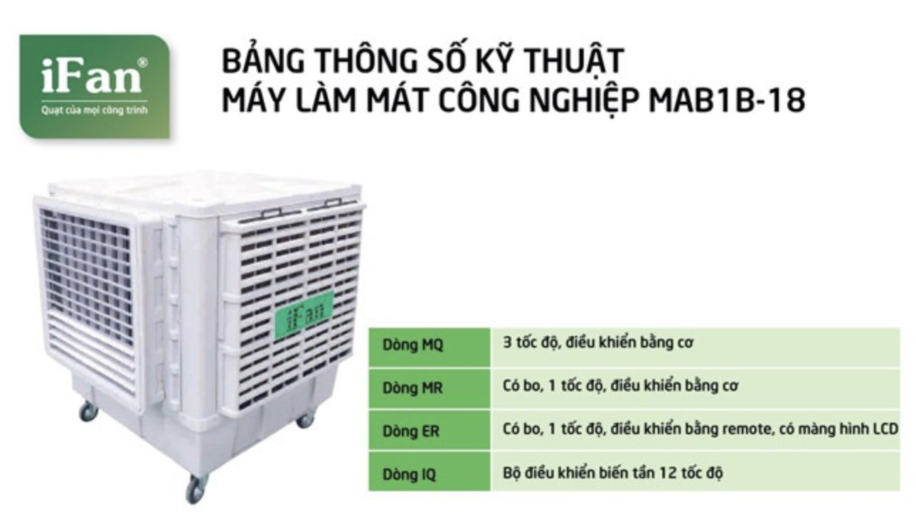 - Quạt làm mát công nghiệp iFan MAB1B là sản phẩm nhập khẩu và lắp ráp trực tiếp tại Nhà máy iFan. Được thiết kế 4 model lần lượt là: MAB1-18MR, MAB1-18MQ, MAB1B-18ER và MAB1B-18IQ, mỗi model mang đến những giá trị cũng như nhu cầu khác nhau đến từng khách hàng của iFan.