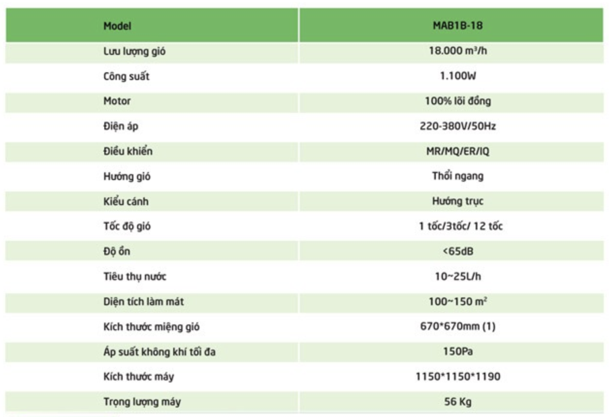 - MAB1B có khả năng làm mát nhanh chóng trong phạm vi 100-150m² bất kể không gian nào, với lưu lượng gió cung cấp liên tục 18.000m³/h ổn định, quạt đảm bảo mang lại bầu không khí mát mẻ nơi sử dụng.