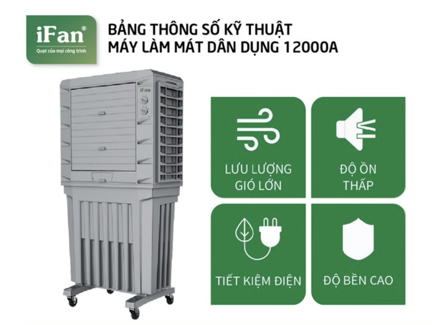 - Quạt làm mát iFan-12000A bằng hơi nước, tự động cấp ẩm khi không khí khô hạn. Người sử dụng sẽ không có cảm giác bị khô da, khô ráp biểu bì, mắt, mũi trong cổ như lúc dùng máy lạnh. Lại không phun sương, không gây ẩm ướt hư hại thiết bị điện.