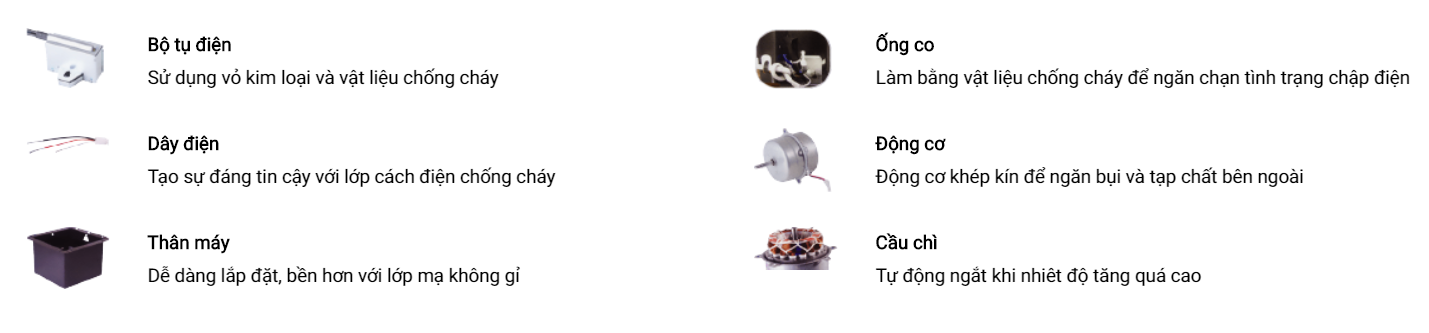 – Những bộ phẩn có thể cách điện và chống cháy như bộ tụ điện, dây điện và ống co. Với chất liệu chống cháy này sẽ ngăn chặn được tình trạng chập điện. Cháy nổ gây nguy hiểm đến tính mạng con người.