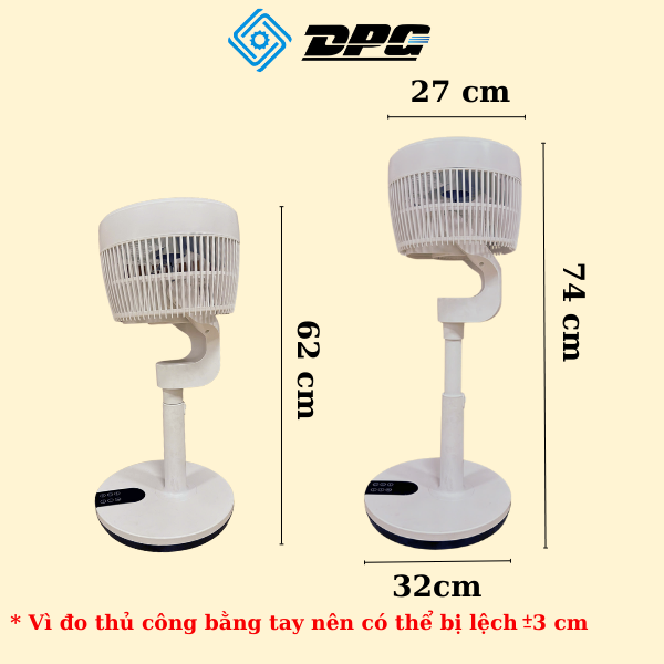 Kích thước tham khảo: đầu quạt 27 cm – đế 32 cm – chiều cao điều chỉnh 71–89 cm