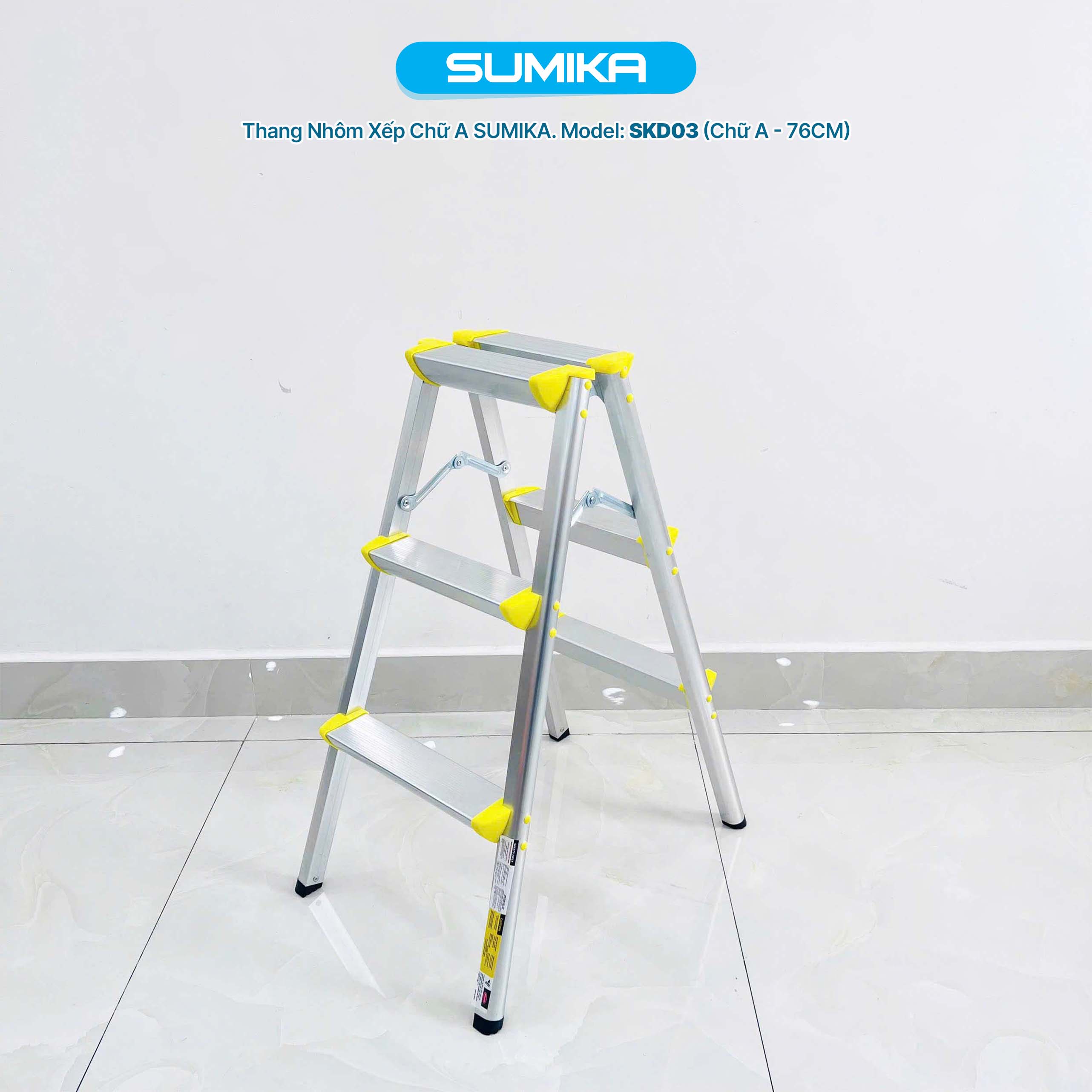 Một trong những sản phẩm tiêu biểu của Sumika là thang nhôm xếp chữ A model SKD03. Thang có độ rộng chân 40cm, chiều cao dạng chữ A là 76cm, với thiết kế gồm 2 đoạn, mỗi đoạn có 3 bậc. Khi gấp gọn, chiều dài thang chỉ còn 81cm giúp tiết kiệm không gian cất giữ. Các bản bậc thang có độ rộng 7cm, riêng bản bậc trên cùng rộng 17cm tạo cảm giác vững chắc khi đứng. Khoảng cách giữa các bậc là 25cm, phù hợp cho việc leo trèo an toàn và thoải mái. Thang có tải trọng chịu lực lên đến 100kg, đáp ứng nhu cầu sử dụng trong gia đình và các công việc nhẹ.
