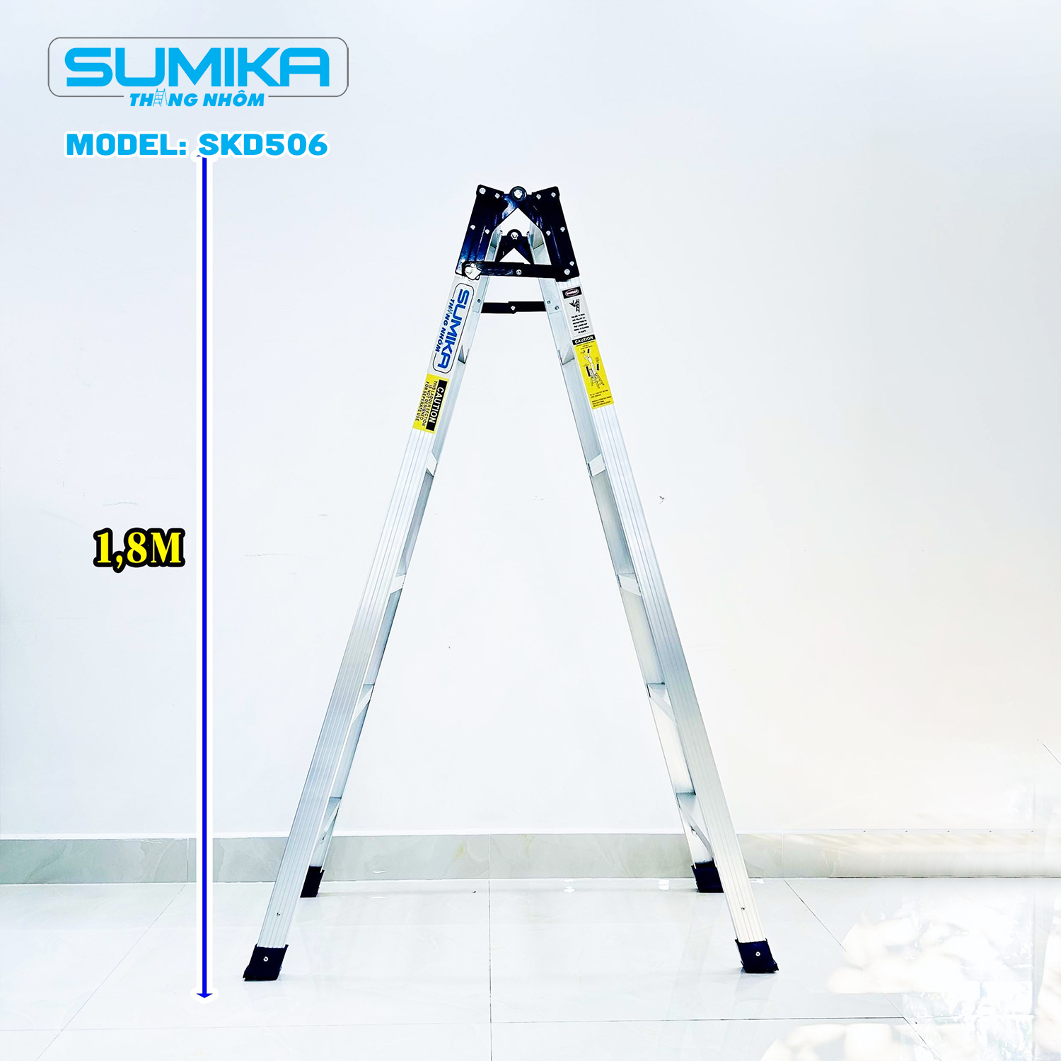 SUMIKA là thương hiệu sản xuất thang nhôm được nhiều khách hàng quốc tế, trong đó có Việt Nam, tin dùng nhờ chất lượng an toàn và quy trình sản xuất nghiêm ngặt theo tiêu chuẩn Châu Âu. Sản phẩm thang xếp nhôm chữ A của SUMIKA chủ yếu làm từ nhôm hợp kim cao cấp, vật liệu nhẹ, bền, không bị ăn mòn hay gỉ sét. Chân đế thang được lót nhựa ABS có các rãnh sâu giúp chống trơn trượt, cố định thang chắc chắn khi sử dụng. Thang SKD506 còn trang bị hai tay giằng bằng nhôm hợp kim T6063 dày 3mm, tăng cường độ vững chắc cho khung thang.