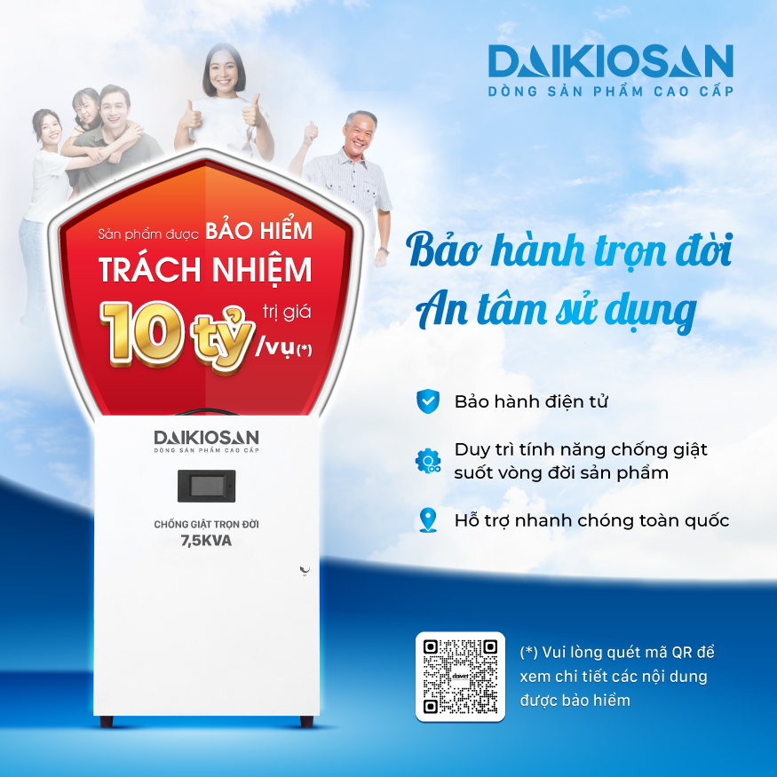 Ngoài bảo hành, Daikiosan cung cấp gói bảo hiểm trách nhiệm sản phẩm tối đa 10 tỷ đồng/sự cố, giúp người dùng yên tâm khi lắp đặt và sử dụng: