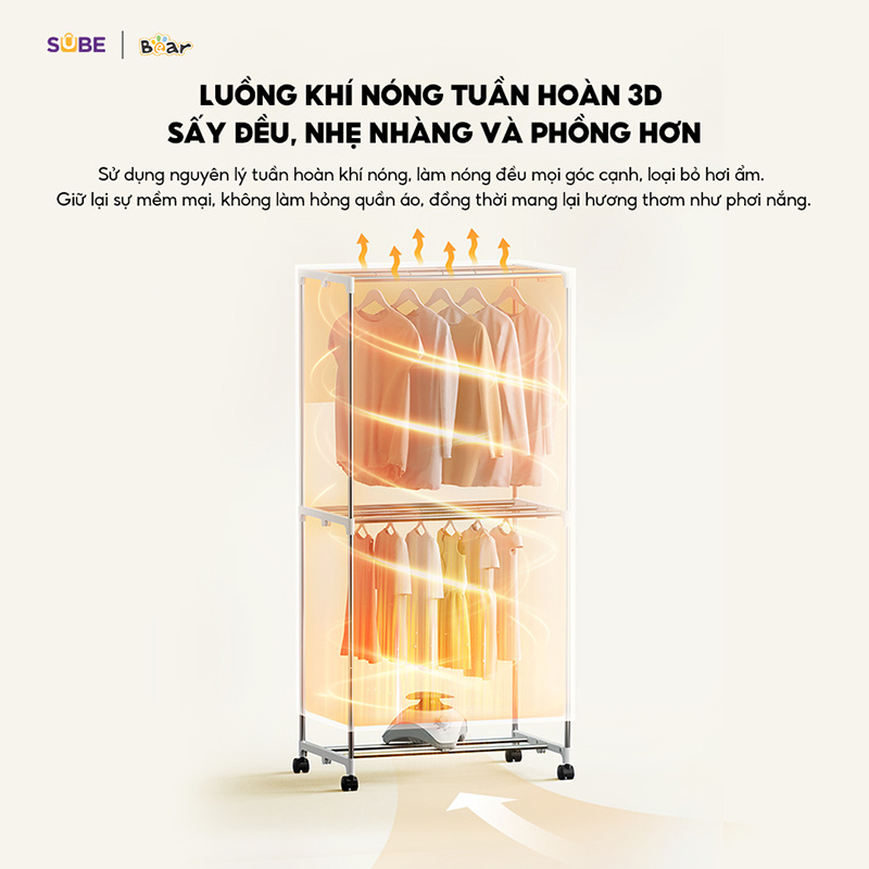 Với công suất 1200W và khả năng sinh nhiệt cao, quần áo sẽ được sấy khô một cách nhanh chóng. Ngoài ra, Tủ sấy sử dụng nguyên lý tuần hoàn khí nóng, làm nóng đều mọi góc cạnh, loại bỏ hơi ẩm giúp quần áo được làm khô nhẹ nhàng, giảm thiểu tình trạng bị co rút, nhăn nhúm hoặc phai màu, luồng khí nóng giúp loại bỏ các mùi hôi khó chịu trên quần áo mang đến cho bạn cảm giác dễ chịu khi mặc quần áo như được phơi nắng.