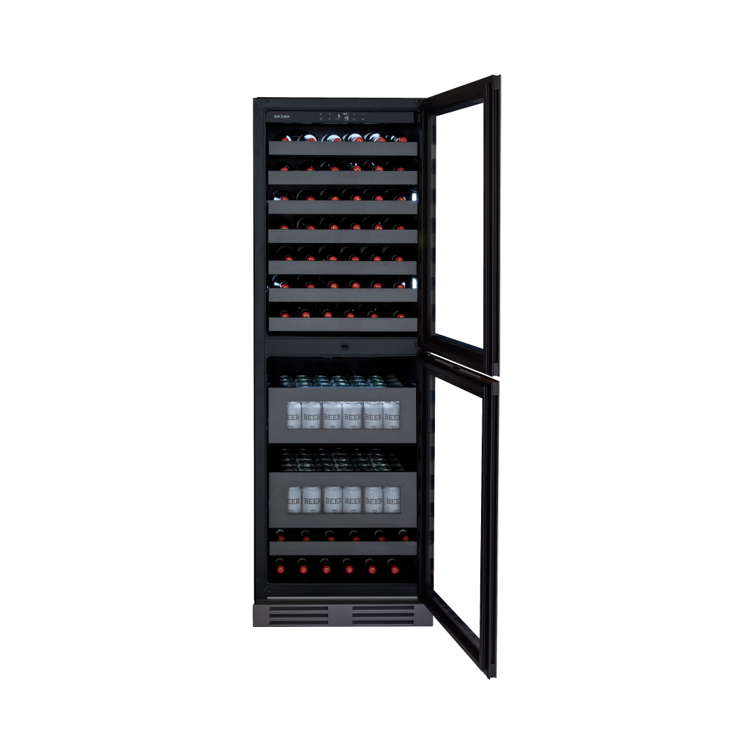 Sự kết hợp giữa kệ gỗ trượt sang trọng dành cho rượu vang và kệ tùy chỉnh cho nước uống hoặc bia (trong mẫu KM80WBC) mang lại sự linh hoạt tối đa, đáp ứng mọi nhu cầu lưu trữ.