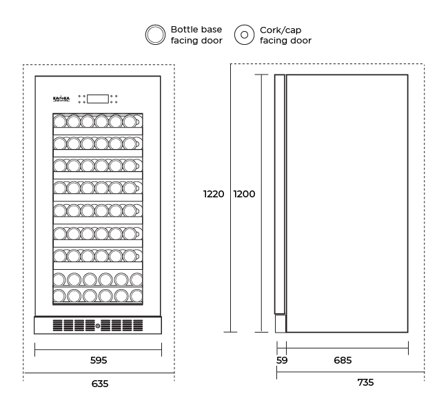 Kích thước tổng thể của tủ là 1200 x 595 x 685 mm (Cao x Rộng x Sâu), vừa vặn để bố trí trong các không gian hiện đại như phòng khách, phòng ăn, hầm rượu chuyên dụng hoặc quầy bar tại gia. Dung tích lớn kết hợp thiết kế hợp lý giúp KS106TL không chỉ là nơi lưu trữ mà còn trở thành một điểm nhấn sang trọng trong nội thất.